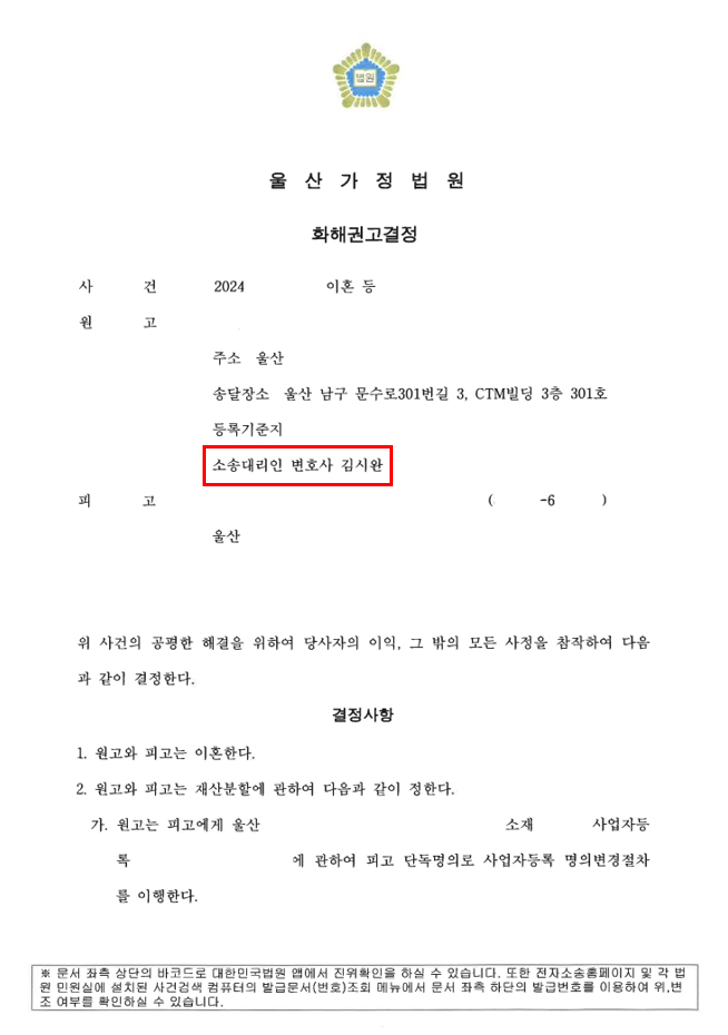 작성된 합의서를 바탕으로 이혼소송을 진행 중인 재판부에 화해권고결정 신청서를 제출하였습니다.