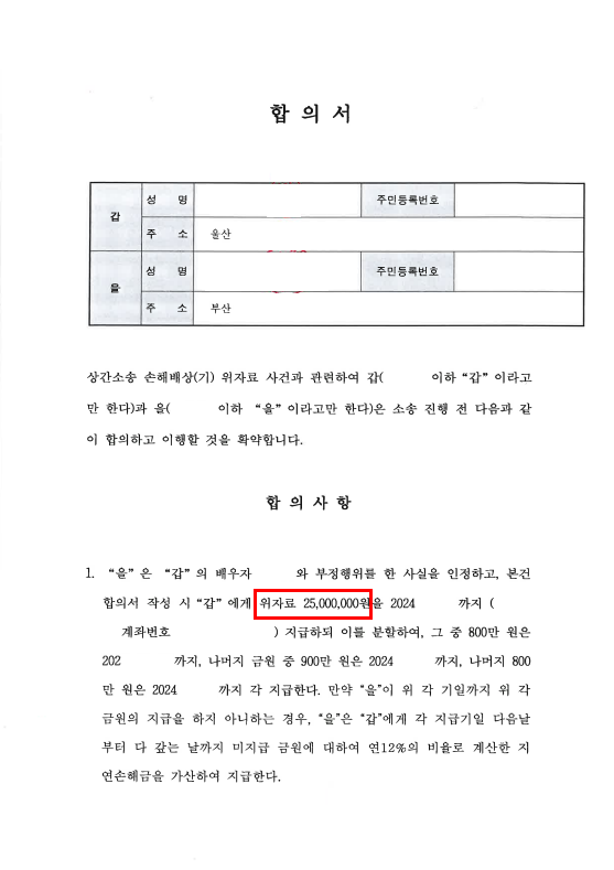 작성된 합의서를 바탕으로 상간소송 원고 측 의뢰인을 대신하여 부산에서 상간남과 합의를 하였고,