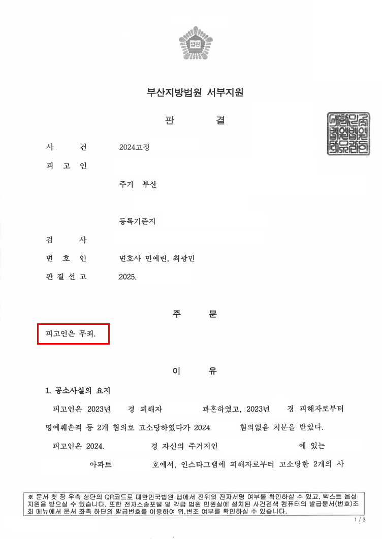 경찰/검찰의 수사단계를 거쳐 “법원단계”에서 5%라는 희박한 확률 속에서도 재판부로부터 모욕죄 혐의에 대한[무죄 판결]을 이끌어 낼 수 있었습니다.