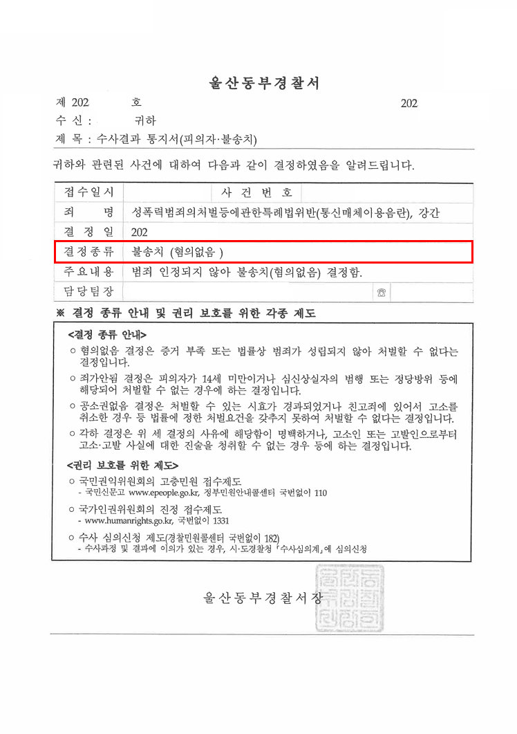 피의자와 피해자 간 주장이 첨예하게 대립하고 DNA 증거가 존재했으며, 별건 성범죄 피해자가 다수이고 일부 혐의를 인정한 상황이었음에도 불구하고 "불송치 결정"으로 혐의없음을 이끌어 낼 수 있었습니다.