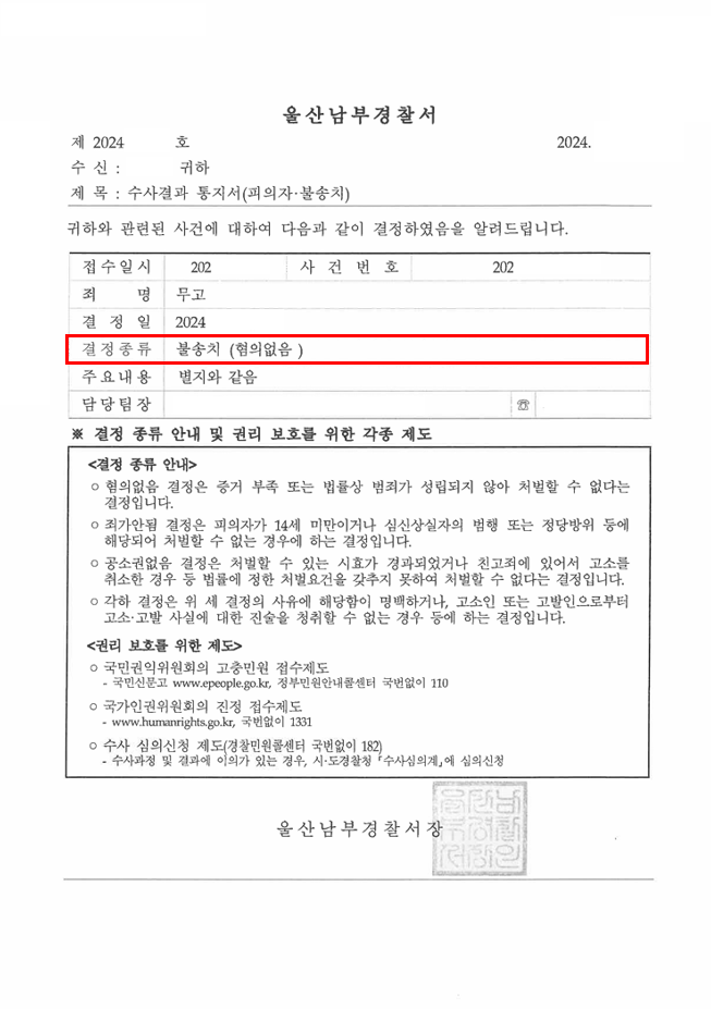 무고죄 피의자로 입건되어 목격자들의 비협조로 사실관계 입증에 어려움을 겪으며 처벌 위기에 놓였음에도 불구하고 경찰의 불송치[혐의없음] 결정을 이끌어낼 수 있었습니다.