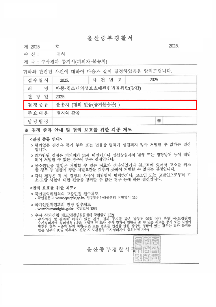 아동ㆍ청소년의성보호에관한법률위반(강간)죄에 대하여 의뢰인이 가장 희망하시던 경찰의 [혐의없음 불송치] 처분을 성공적으로 이끌어낼 수 있었습니다.