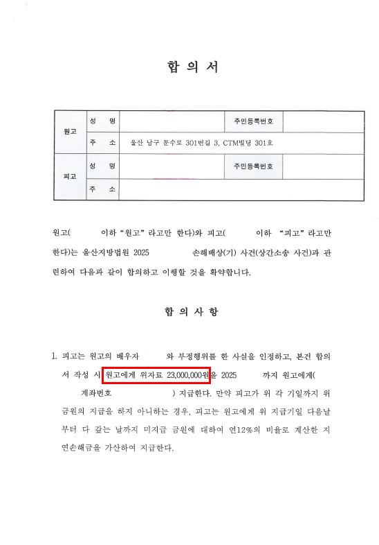 상간소장 접수 “단 하루” 만에 피고 책임에 한정하여 2,300만 원이라는 고액의 위자료를 지급받고, 소송 중인 법원에 소 취하서를 제출함으로써
