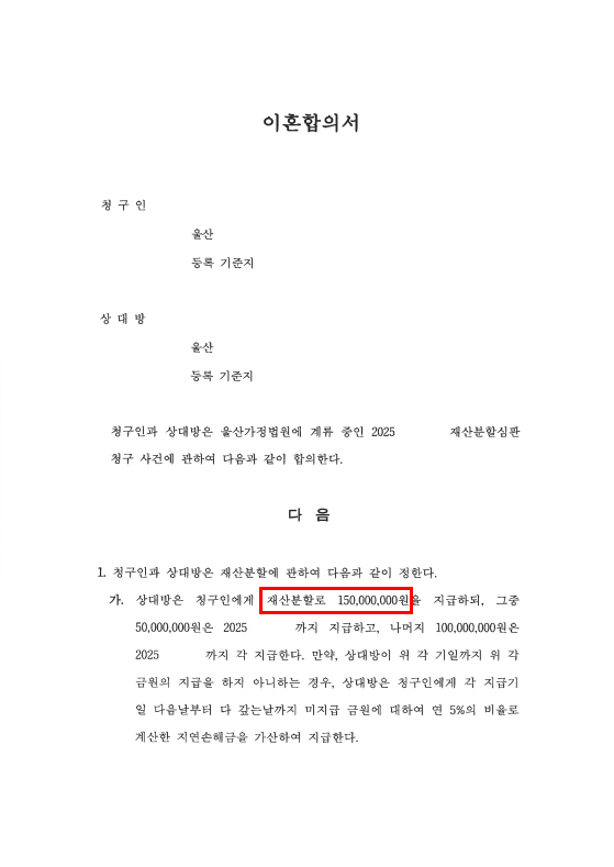 상대방의 합의의사를 확인한 즉시 의뢰인과 소통ㆍ구체적인 니즈를 확인하여 상대방은 청구인에게 재산분할금으로150,000,000원을 지급한다,