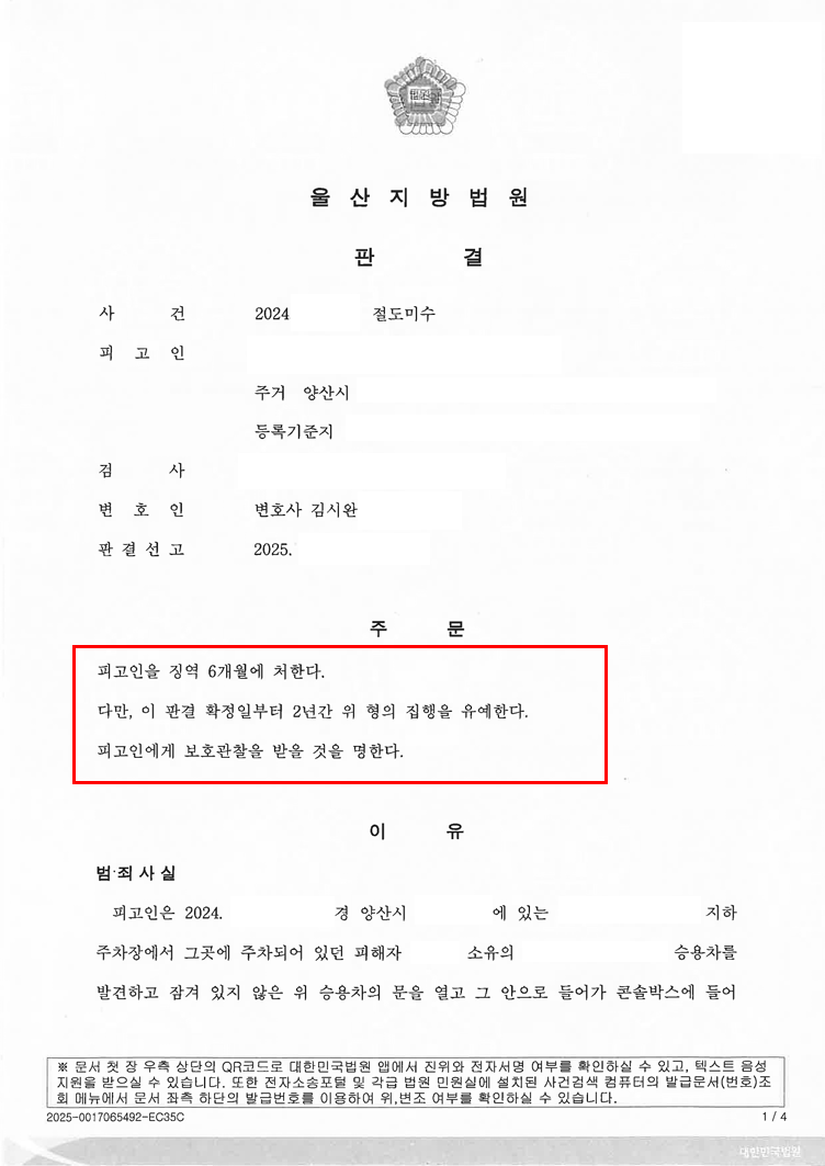 의뢰인은 양산 소재 지하주차장에서 피해자 소유의 차량이 잠겨 있지 않은 채 주차되어 있는 것을 발견하고