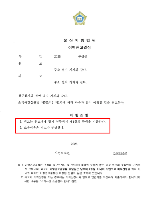 청구한 금액이 모두 인용ㆍ법원으로부터 이행권고결정이 내려졌고, 해당 결정에 대한 이의신청 없이 구상금 청구 사건이 확정됨으로써 의뢰인은 희망하신 금액 전액을 변제받을 수 있었습니다.