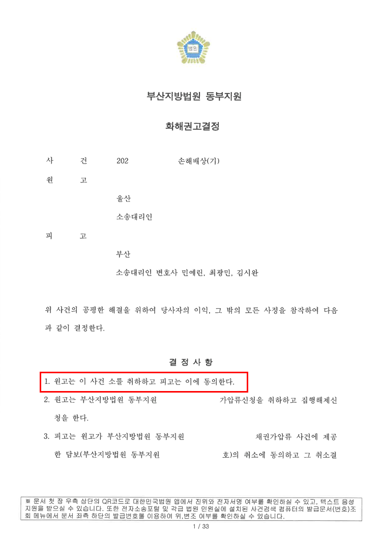 등의 조건을 포함한 합의서와 함께 화해권고신청서를 제출ㆍ화해권고결정이 내려졌으며 당사자의 이의신청 없이 해당 [화해권고결정이 확정]되었습니다.
