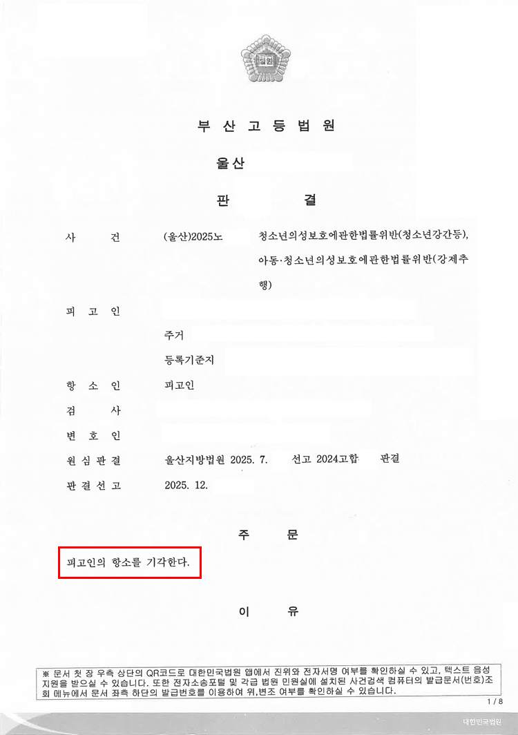 항소심에서도 재판부로부터 [피고인 항소기각] 판결을 이끌어내며 사건을 성공적으로 마무리하였습니다.