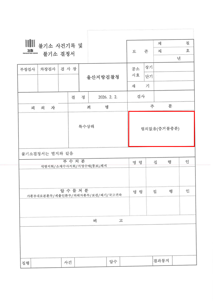 검찰은 울산형사전문변호사 법무법인 나우의 주장을 모두 받아들여 의뢰인의 특수상해 혐의에 대하여 [혐의없음 불기소] 처분을 내렸습니다.