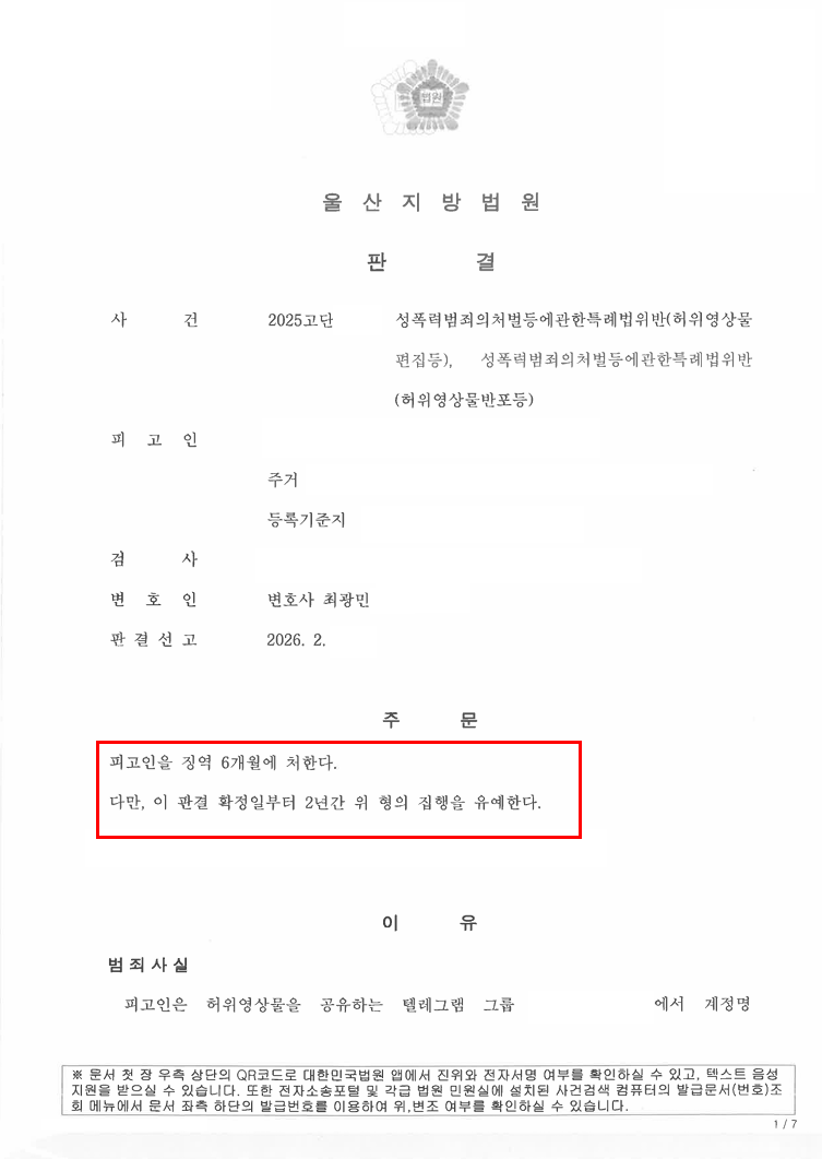 울산성범죄전문변호사 법무법인 나우 울산형사전문변호사의 체계적인 조력과 전략적인 대응을 통해 아이돌딥페이크성범죄 혐의에 대하여 집행유예 판결을 이끌어낼 수 있었습니다.