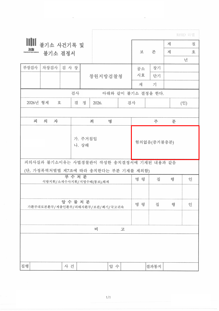 위 모든 내용을 종합하여 피의자에 대한 주거침입죄 및 퇴거불응죄, 상해죄 혐의가 인정되지 않는 점을 재차 강하게 주장하며 혐의없음 불송치 결정을 요청하였습니다.
