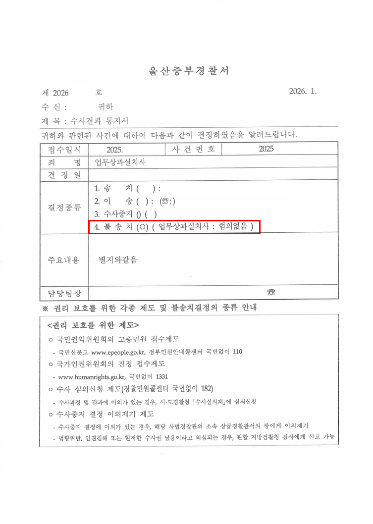 경찰은 울산형사전문변호사 법무법인 나우의 주장을 모두 인용하여 피의자의 과실과 피해자 사망에 인과관계가 없다며 병원 낙상사고, 업무상과실치사혐의에 대하여 무혐의 불송치 결정을 하였습니다.